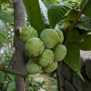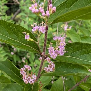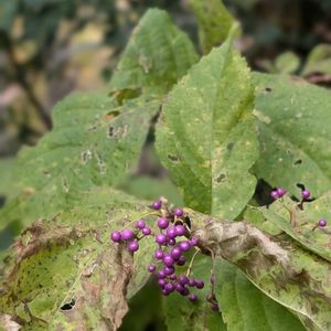 今日のお花は大山山麓に自生の紫式部です ①②③④ムラサキシキブ⑤アオネカズラ 後ろの大木ナラに着生シダ