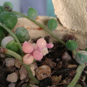 12月になりましたね🎄 今朝は嵐のような天気で真っ暗😣 植物達の写真は全然撮れなかったので撮り溜めていた写真。 まだお外にいるマーブルネックレスさん。 新芽さんがとってもピンクで可愛いです🩷