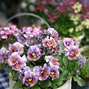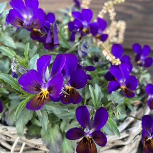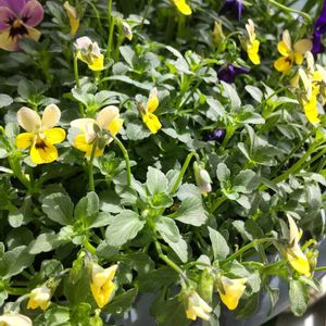 エム・アンド・ビー・フローラ 極小輪ビオラの寄せ植えを造りました。😃💮💐 一輪がとても小さいので周りにアリッサムを解体してちりばめてみました。😃 紫色のは、夜空ノムコウ だそうです。😃 黄色のは、1/3での見切り品で100円でした。即籠入れ😁 根が落ち着くまでこのあと、マルガリータです。😃😂