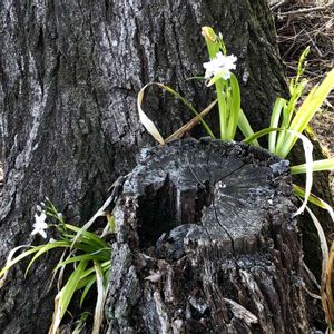 平出の公園で、大木の割れ目に咲く、 シャガの花が、必死に根をはります❗️ 偶然に見つけた、過酷な共存と生存競争を 私に、呼び掛けます❗️