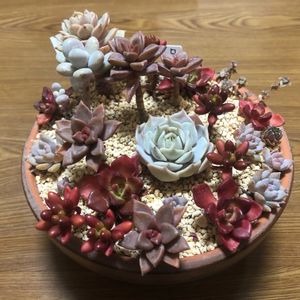 水持ちのことをよくわからないまま作った鉢。鹿沼と素焼き鉢の組み合わせは乾き過ぎてすぐに下葉が枯れてしまうので、そろそろ解体しようかと思います😅 おかげで虹の玉とレティジアが真っ赤というか、むしろ黒いです…💧