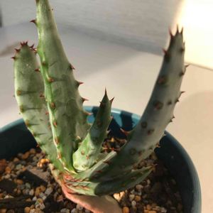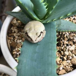 垂れ下がるような長い葉をつけるアロエ。 子株が2つ潜んでいた。 群生したら面白そうだ。