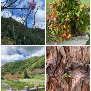 知明湖キャンプ場🏕 神無月の八重桜 破天荒な生け花風 花壇 セイタカアワダチソウのある風景 向こうのツリー🌲の樹皮😮🌱