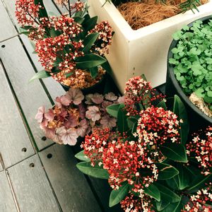 大事にしているスキミアが、 なぜかどんどん咲いてしまう。 なるべく日陰で風通しも良くして育てているのに。 3月くらいまで真っ赤な蕾が楽しめるはずなのに、なんで咲いちゃうんだろう?