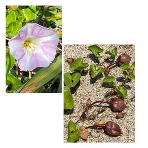 浜遊びたのしみました😆 浜辺で出会った草花 綺麗でしたよ! 💗イモタカバミの下にある💚はハマヒルガオの葉です😉👍