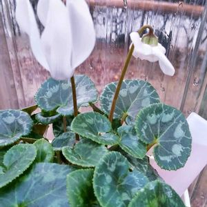 種からのシクラメン2個目が開きそうです ピンク期待したけど白でした🤍🤣🤗