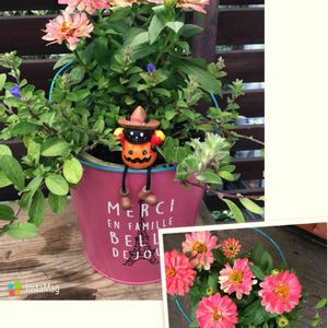 久しぶりにお花屋さんに行ってジニアとアメリカンブルーをお迎えしました💗💙 ピンクのバケツ100円でした💕 ダイソーで買ったハロウィン🎃ネコちゃん🐱 綺麗なピンクのジニア可愛い(∩ˊᵕˋ∩)・*