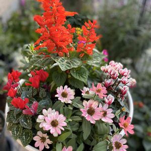 秋の寄せ植え 赤いサルビア(ブルーサルビアと入れ替えて) ピンクジニア ガーデニングシクラメン2色