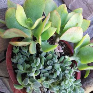 昨日撮影の1枚📷 クラッスラ属の斑入りアポロ(ゴーラム錦)とブルーリボン。 植えつけてから全く水やりをしていなかったので、水をあげて少し日光浴☀