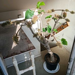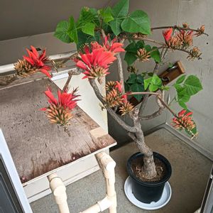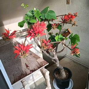 沖縄県花デイゴですが花弁を振るいながら他の花序を伸ばし蕾を膨らませながら花を咲かせる段階に入っているようです。しかし今回は4年前に比べ花数が20輪以上ありバランスも良く葉も全体的に少し出ているだけなので咲いたらかなりインパクトがあると思いますよ