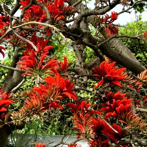 沖縄県花デイゴですが全体的に花弁が開いてきました。そして床がレッドカーペットになっています。ちなみに沖縄名木百選を調べたら本部町に樹齢200年、樹高13m.幹周5mのがありました。もし話せたらきっと琉球王国時代を語ってくれるのでしょうね!