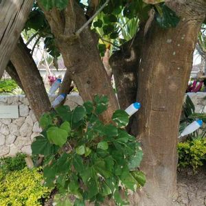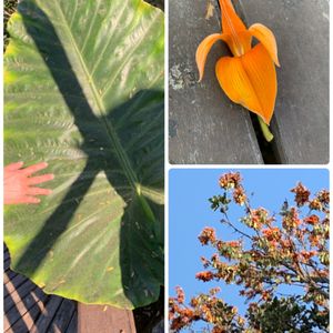 ミャンマー🇲🇲の色々な樹木 右上下 デイゴの一種 沖縄で有名な花🌼ですね 左はクワズイモ たやさんに名前を教えて頂きました🙇♀️ 異常に大きい葉っぱ🌿 地元民の手も参加😊