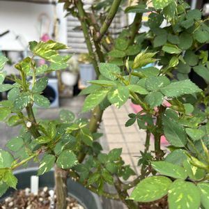 斑入り葉の薔薇さんヘルシューレンさん最近の暖かさで新芽の展開がなされてます。葉だけでも綺麗😍