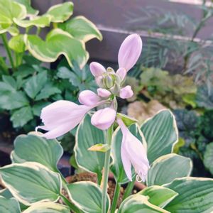 ホスタ、咲いています🍀 淡い紫のお花も、クリーム色の縁取りのある🌿も涼しげです🎵 ホスタと言うより、ギボウシと言った方がしっくりします( *´艸`)