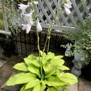 つるばらサマースノーの株元に植えている2年目チビチビホスタ。 こちらは5日前に撮影したもの。 コロンと丸くて肉厚な小さい葉に似合わず、アンバランスに大きなお花が可愛い。 花茎も含めて15cm程? 全体的にギュギュッと小さいです😊 まわりの鉢や植栽である程度の日陰を装ってはいるけれど、陽当たりが厳しくないだろうか。 夏間の様子で移植も検討せねば。 涼しい場所で育てると、葉のブルーがよく出るようです。