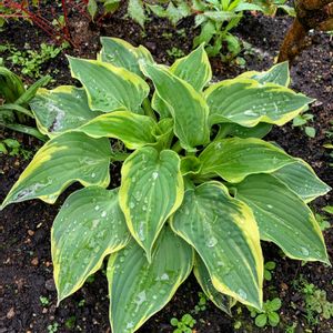 雨⋰⋰ ☂あがりの庭に輝く✨ギボウシ🌿 クリーム色の斑が入った品種 去年ポット苗で迎えた二年生🌱 どれほどに大きくなるのか、葉が増えるのか楽しみです…🌱🎵