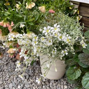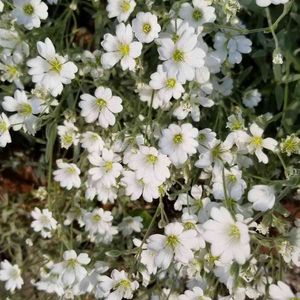 🌿マイガーデン🌿より セラスチュームちゃん 昨年ご近所さんから頂いた かわいい白い小花 枯れずに 咲かせることができて よかったぁ♡ 葉っぱが銀葉で 花がなくても ポイントになります