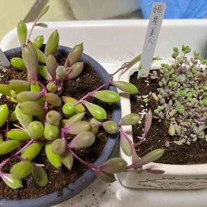 『姫星美人』⁉️。。。『パープルヘイズ』。。。だよね😆💦💦 知らなかったぁ。。。😅✋ 得意の名前狩り💦💦 出てきた鉢の中には 見慣れたつぶつぶちゃんが💜 名札は📛『姫星美人』こだわります😆☝️ 憧れのガレージの 販売会に初参戦👍 みどりのまとめにアップしたので 見てね🍀➰🍀