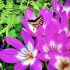 コルチカムとキアゲハ コルチカムに近づくと、綺麗な蝶々が舞っていたので、とまったところを写してみました😊 上手く撮れなかったけど、好きなテーマなので、投稿いたします🙇♂️