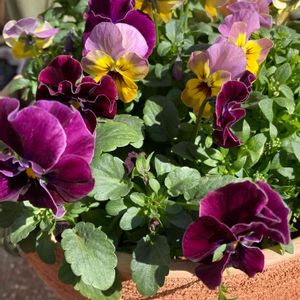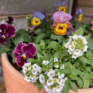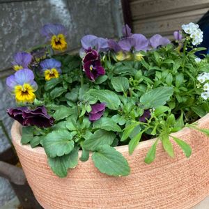先日寄せ植えにしたビオラ「しんしん」とアリッサム😊 素敵な鉢を見つけたので植え替えましたー💙 更に素敵なパンジーも追加🌼 コメリブランド「フリル咲きミニパンジー」です😁 花がら詰みをしたので少し寂しいですが💦