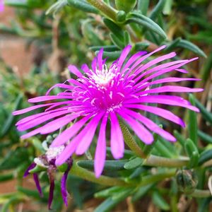 【マツバギク(松葉菊)】 南アフリカ原産、ハマミズナ科多年草 葉と花の形から「マツバギク(松葉菊)」と呼ばれ、多肉質の細長い葉が密生し、キクのような花を咲かせる。 マツバギクには主に「ランプランサス属」と「デロスペルマ属」の2つの種類がある。 ランプランサス属はマツバギク本来の姿に近く、春から初夏に花が咲く。 デロスペルマ属は、「耐寒マツバギク」とも呼ばれ、耐寒性に優れ、初夏から秋にかけて、長く花を咲かせる。 草丈:10~100cm 開花期:4月~5月(ランプランサス属)、6月~10月(デロスペルマ属) 花色:ピンク、赤、オレンジ、黄、白、紫 picは、デロスペルマ属 山口宇部空港にて