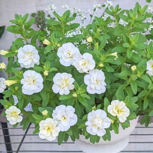おはようございます🌅 PWさんのカリブラコア スーパーベルダブルミルクレープさん🤍 切り戻しの後に猛暑が到来し しばしお花をお休みしてましたが 最近になって咲いてきました✨