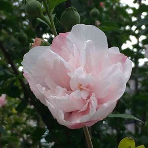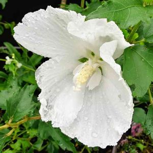 雨のやみ間にパチリ👀📷✨ 一昨年、ご近所さんから枝をいただき挿し木しました🌿🌱 真っ白なムクゲ** まだ背は低いけど、大きな花が咲きました‼️