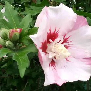 昨日、知人から貰いました。 名前を尋ねましたが、本人も 分からないと?の事です。 昔から裏庭にある木だけど🌲 名前は知らないと(^_^;) 2~3mの木で枝先に花が咲くようです。 花弁は、厚みがあり タチアオイのような質感です。 花径は、2~3cm 葉っぱは、菊の葉っぱのように ギザギザしています。 葉っぱは柔らかいです。