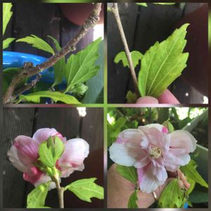 先日投稿した名前の分からない低木 花がしっかり開いたので 再度投稿致します。 幹は桜のような感じで 葉っぱはギザギザで薄くて柔らかいです。 花弁は、縦筋?のようなものがあり 少し香りがあります。 本木の葉っぱは、濃い色には ならないようです。 薄緑~黄緑らしいです。 教えてカメラがムクゲと出て 見てると八重咲きのムクゲだと わかりました⤴︎