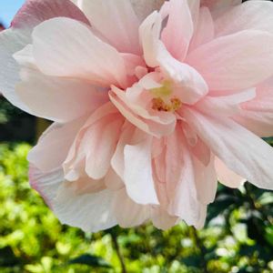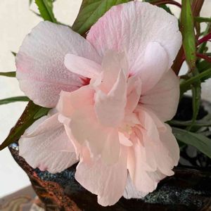 こんにちは*ˊᵕˋ* 今日はとっても涼しくて、ガーデニング日和。朝からセミでは無く、鳥が鳴く一日の始まり… 高原に来ているみたいで、久しぶりに本当に気持ちがいい~✩(*˘︶˘*).:* 曇りだけれど、雲が薄いのか、時折日が指して、明るく涼しい1日でした。 ガーデニングをしていたら、コツコツと木をたたくような音… 公園で誰かが木でたたいているのかと木の根元を覗くと…鳥が木をつついていて、どうやらキツツキのよう… 木をつついている鳥を見るのは初めてで、ちょっと嬉しいな✩(*˘︶˘*).:* 今日のpicは、八重咲きムクゲ ‘ピンクシフォン ’。 7月にお墓参りに行った時に昔良く通っていた園芸店で見つけた八重咲きムクゲ。それから1輪づつ咲く状態から真夏はお花はお休み… やっと少し涼しくなったと思ったら、蕾がたくさん付き始めて、今朝花が4つ同時に咲きました(∩ˊᵕˋ∩)・* 相変わらず可愛い‘ ピンクシフォン’さんです💕 *7月18日に‘ピンクシフォン ’お連れして初めての投稿をしてます。良かったら、見てみて下さいね😊