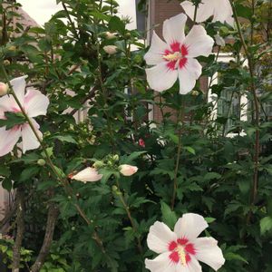 マンションの横で 咲いています😊 盛夏に次々と咲かせる木槿🌺 天気は、良くないけど 白い花は、清々しいですね〜☺️☺️☺️