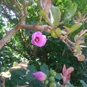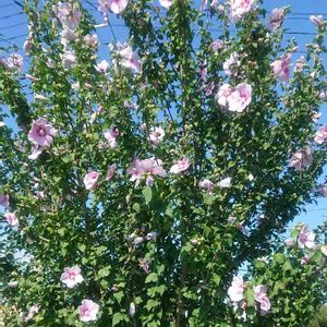 家の裏に咲いているムクゲ 猛暑の中 涼しげに咲いています。 蕾がたくさんあるので、咲くのが楽しみです。