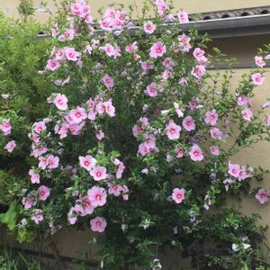 母の庭のムクゲ、満開🌸です。 咲いては萎み落ちるの繰り返しで、落ちた花掃除が大変です。 先日のブラシの木もこのムクゲの木も私が挿し木で増やし、持って来ました。 もう10年以上経ってますね〜〜😀💕 ここの庭の方が居心地が良さそうです😍
