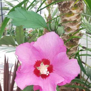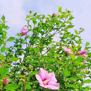 こんにちは👋😃 いまいち…ぱっとしない天気☁ この間🏠お迎えしたムクゲ三姉妹?の1つが咲き出しました🎵 桃花笠 一番乗りで咲きました🎵