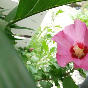 小さな庭のひしめき合った中で ムクゲが可愛らしく咲き出しました。 狭くてごめんね🤣