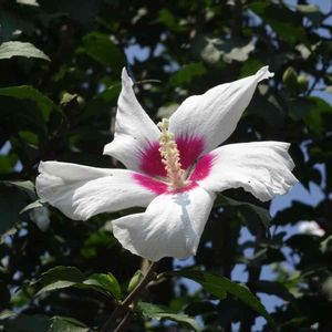 【No54 ムクゲ】 監物台樹木園から2枚目はムクゲ。韓国の🇰🇷国の花です。 花言葉は「信念」「新しい美」。「信念」は、十字軍にちなんでいるそうです。 「槿花一朝の夢」と表現されるように、朝花を開き、夕方にはしぼんでしまいます。でも「新しい美」。次々と花が咲くのですね。