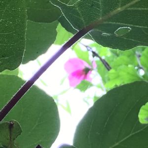 おはようございます☺️🌸 キウイ棚の間から高い所に咲いてるムクゲの花を発見‼️ 下の方に全然咲いてないので、手を伸ばしスマホで最大に拡大して撮りました😅