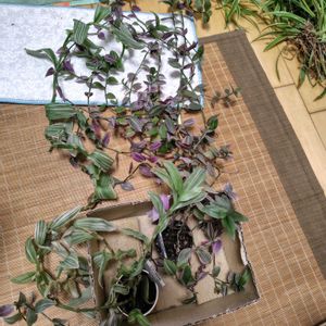 ダイソー産トラディスカンチアさん(トラディスカンチアさん内の誰かは不明)です。 順調に伸びてます。 白い斑のコとピンクの斑のコがいます。 下に敷いてあるのは、吸水マットです。このコたちの上にぶら下がっているエアプランツ達のお水やり🚿した後にみずが垂れても大丈夫なようにしているのですが、ふかふかのこれの上にトラディスカンチアさんが伸びてます。おふとん状態🛏️🤣。 葉焼け防止のため、夏はベランダに外出禁止🈲です。 このため、ピンクのコはピンクが薄くなっています。ピンクが濃くなるには日光浴⛱️がかかせません。 秋🍁🍄🍇🍠🍄🟫🌰🥜が待ち遠しいかな。