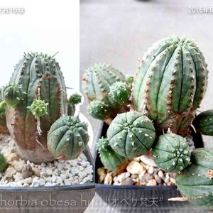 オベサ交配種・オベサ梵天。同じ名前だけれど交配相手が違う、タイプ違いがあるみたい。これは、やや柱状に伸びて、子吹きする様子から見て、たぶん紅キリンあたりがまじっていそう。それでいてオベサのぽってりした感じが出ていていいかんじ。これも買った当初と比較してみた。角度を合わせ切れなかったけれど、関係ないくらいの成長っぷり。これも来春植替えかな? 置き場所に困りそう~!
