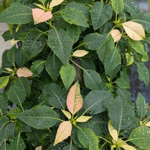 雨に濡れたポインセチア キャンディシナモン 短日処理は終わり。 去年の冬のダメージがひどく、 夏の復活もままならないまま また冬を迎えます。 挿し木してたら良かったなぁ