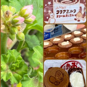 咲いたら朱色のゼラニウム🤗 ~~~と~~~昨日30分待ちで食べた(笑) 3月の、山形限定(土日)あじまん😋 皮がcocoa🍫中はミルククリーム🐄 美味しかった❣️ 驚きはなかった╮(´・ᴗ・` )╭