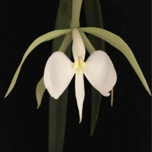 Epi. falcatum 原種の着生ラン 花 7x10cm 下垂して成長します。 細くて分厚い葉も、下垂するユニークな花です。