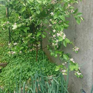レモンが咲き始めました。 その手前はタマネギ畑になっています。 この向きから写真に撮ると、必要以上にワサワサして見えますね。