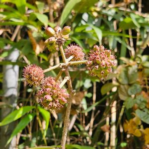 初見👀 ケヤマウコギ(毛山五加木) ウコギ科 ウコギ属 9~10月 1~3m 落葉低木 在来種 別名∶オニウコギ 雌雄同株 葉は互生(長枝に互生、短枝に束生) 掌状の5小葉からなり頂小葉が一番大きい 葉質は厚く、先端はやや急に細くなって尖り、基部は葉柄に流れる 葉縁は重鋸歯 表面は緑色で全体に細毛がありザラつく 葉裏には灰褐色の縮毛が密生 花序は球状で枝先に1~5個 先端(中央)の花序は両性花のみからなり、先に開花し始める 下部の花序は雄花が混じる (花序内に両性花と雄花が混生する) 花は緑白色~紫褐色の5弁花 雄しべは5個で花弁より長く、花柱は2浅裂 花よりも気になった画像5枚目 「こういう葉の出方をするのか!」 「ピクミンかw」 と目をパチクリさせながら嬉々として触りまくっていたのですが、どうやら※虫えい(虫こぶ) のようです🤣 (とても硬かった😂) ※「ケヤマウコギトガリキジラミ」によって形成される「ケヤマウコギツボミトジフシ」(虫こぶの名) 果柄や葉柄、果実にもできるようです✨ (普通、できる部位や形態によって虫こぶの呼び方は変わるものと思っていたのですが、上記「ケヤマウコギツボミトジフシ」しか検索で辿り着けませんでした🥹) 面白かったな(〃∇〃)