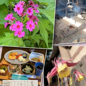 サクラソウと、オダマキ、まだここでは咲いてました🎉🎉 囲炉裏、久しぶり見た😅 懐かしい物が、いっぱいです