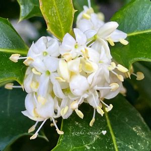ヒイラギ(学名: Osmanthus heterophyllus 英名: Chinese-holly 和名:柊)の花🌸🌿🌺 柊(ヒイラギ)は、葉の縁がノコギリの歯のようにギザギザしているのが特徴の常緑高木です。 ヒイラギは、耐寒性があり丈夫な樹木で、山野に自生する他、公園や庭園の植栽としても人気があります。11月~12月に濃いグリーンの葉の脇から白く香りの良い小花を塊のように咲かせ、翌年の初夏に黒に近い紫色の果実を実らせます。 可愛らしいヒイラギの花をお楽しみください。 🌸🌿🌺