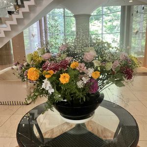 ホテルのロビーに飾られていた素敵なフラワーアレンジ💐✨ 今日のお花カーネーション❤️🩷を中心にツツジ🧡やヤマブキ💛ガーベラ❤️等のお花が綺麗にアレンジされていました😍💖 🏷️今日のお花に参加させて頂きます🥰