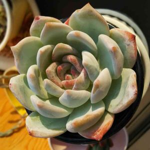 エケベリア トロムソ 中央がジュレた色合いをするのが特徴です🤗 何も知らない人が見たらヒヤッとするかもです😅 しかし、中央がピンクに色付き可愛い1品です🥰