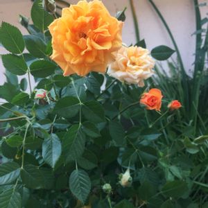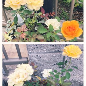 黒星病のうちの薔薇 特別品種っていうタグだけ付いてて品種は不明 咲き始めは1番右のマンゴーの様なオレンジ色なんだけど 日にちが経つと左の色に変わります♡