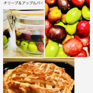 おはようございます🤗 番外編 食欲の秋😋 カラフルなオリーブをいただきました🫒1ヶ月後は、美味しい塩漬けになります💕 花友さんにレシピを教わって、アップルパイにチャレンジしました。 格子状の組み合わせが、ザツに🤣💦でも美味しかったです♡ ありがとうございます🥰
